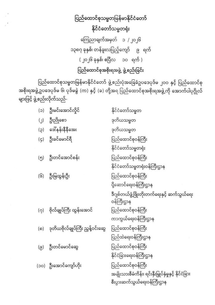 နိုင်ငံတော်သမ္မတအဖြစ် ဦးမင်းအောင်လှိုင် တာဝန်ယူပြီး ဖွဲ့စည်းပုံအခြေခံဥပဒေပုဒ်မ ၂ဝဝ နှင့် ပြည်ထောင်စု အစိုးရအဖွဲ့ဥပဒေပုဒ်မ ၆၊ ပုဒ်မခွဲ (က) နှင့် (ခ) တို့အရ ပြည်ထောင်စုအစိုးရအဖွဲ့ကို စတင်ဖွဲ့စည်းကြောင်း နိုင်ငံတော်သမ္မတရုံးမှ ကြေညာချက်အမှတ် ၁/၂၀၂၆ ဖြင့် ဒီနေ့ ဧပြီ ၁၀ ရက်မှာ ထုတ်ပြန်လာပါတယ်။
