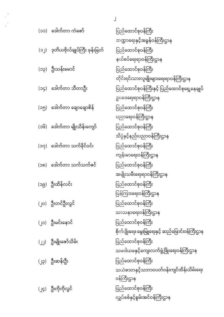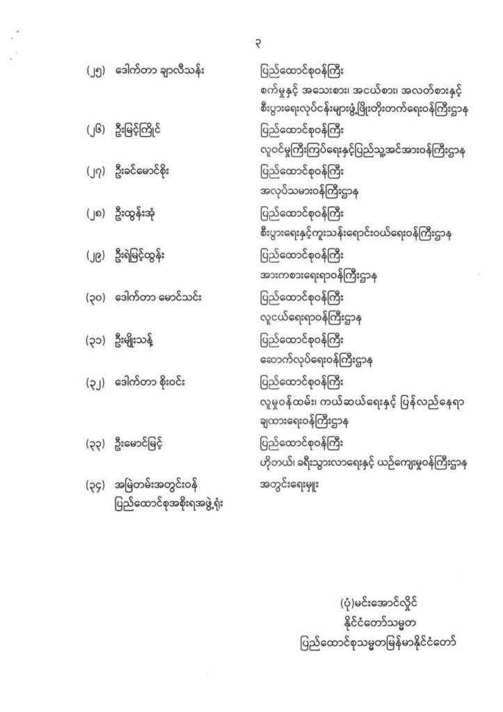 ဒါ့အပြင် နိုင်ငံတော်သမ္မတရုံးရဲ့ ပြည်ထောင်စုဝန်ကြီးအဖြစ် ဦးခင်မောင်ရီ၊ နိုင်ငံတော်သမ္မတရုံးဝန်ကြီးဌာန ပြည်ထောင်စုဝန်ကြီးအဖြစ် ဦးတင်အောင်စန်း၊ ပို့ဆောင်ရေးဝန်ကြီးဌာန၊ ဒစ်ဂျစ်တယ်ဖွံ့ဖြိုးတိုးတက်ရေးနှင့် ဆက်သွယ်ရေးဝန်ကြီးဌာန ပြည်ထောင်စုဝန်ကြီးအဖြစ် ဦးမြထွန်းဦး၊ ကာကွယ်ရေးဝန်ကြီးဌာန ပြည်ထောင်စုဝန်ကြီးအဖြစ် ဗိုလ်ချုပ်ကြီးထွန်းအောင်၊ ပြည်ထဲရေးဝန်ကြီးဌာန ပြည်ထောင်စုဝန်ကြီးအဖြစ် ဒု-ဗိုလ်ချုပ်ကြီးညွှန့်ဝင်းဆွေတို့က တာဝန်ယူသွားမယ်လို့ ဆိုပါတယ်။