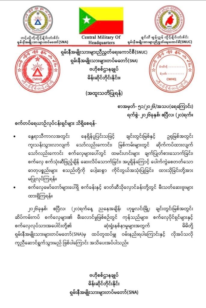 ဟုမ္မလင်းမြို့၊ ချင်းတွင်းမြစ်အတွင်း ဆိုက်ကပ် စစ်လှေများ၏ မီးလောင်မှုဖြစ်စဉ်မှာ ကုန်ပစ္စည်းတွေ၊ စစ်လှေပိုင်ရှင်တွေ နဲ့ စစ်လှေလုပ်သားအပေါင်းတို့ရဲ့ ဆုံးရှုံးနစ်နာမှုတွေအတွက် မိမိတို့ SNA မှ ထပ်တူထပ်မျှ ဝမ်းနည်းရပါကြောင်းနဲ့ လိုအပ်သလို ကူညီဆောင်ရွက်သွားမယ်လို့ အသိပေးထုတ်ပြန်ထားပါတယ်။