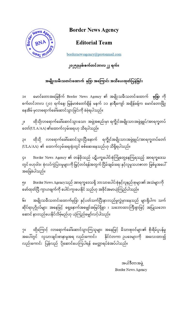 အမျိုးသမီးသတင်းထောက် မုဒြာ နဲ့ ပတ်သက်ပြီး နားလည်မှုလွှဲမှားနေတာတွေရှိပါက သက်ဆိုင်ရာ ပုဂ္ဂိုလ်တွေအနေဖြင့် ရှေ့နောက်အမျှော်အမြင်ရှိစွာ၊ သဘောထားကြီးစွာဖြင့် အပြုသဘောဆောင် နားလည်ပေးနိုင်လိမ့်မယ်လို့ ယုံကြည်မျှော်လင့်ကြောင်း BNA က ပြောပါတယ်။